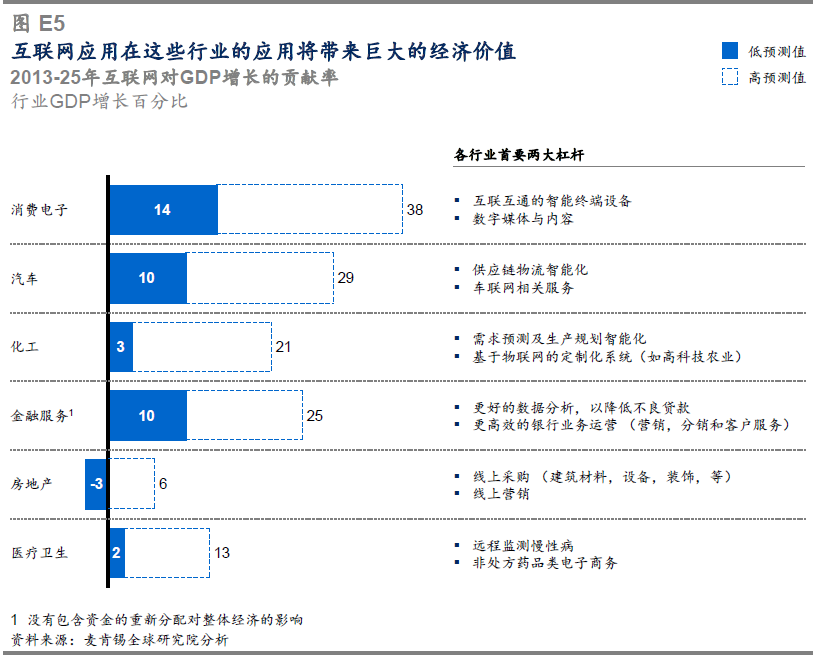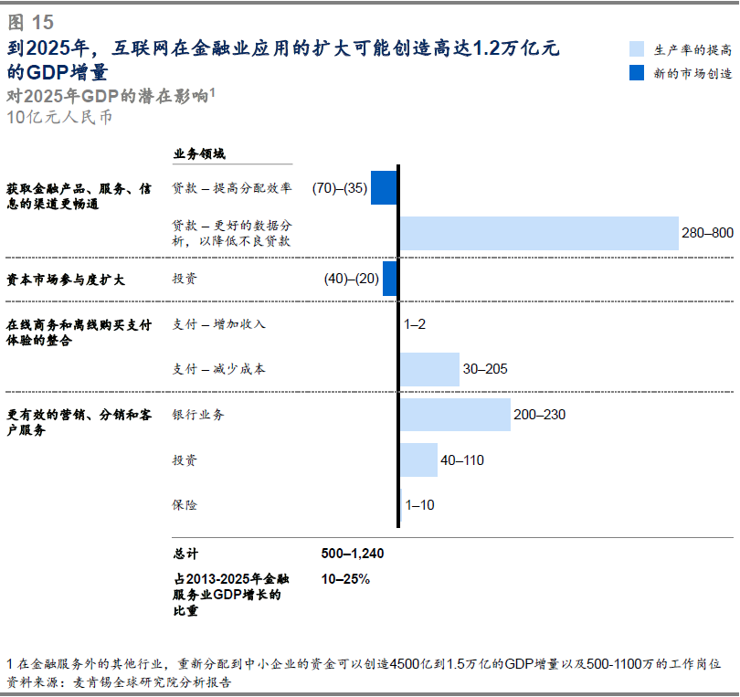 金融服务。通过对互联网上海量的实时数据分析,银行可降低不良贷款风险,而在线渠道提高了市场营销和与客户互动的有效性。风险管理提升、交易成本下降,银行得以服务更多零售客户和中小企业。目前,中国消费者有大约60%的金融资产放置于银行存款,未来随着互联网降低了交易成本,提升了信息透明度,网上货币市场基金、折扣券商和第三方在线市场开始出现。在线支付平台为网络零售交易提供了关键的基础,亦推动了实体零售消费的增长。预计到2025年,互联网对金融业GDP增长的贡献度为10%到25%。