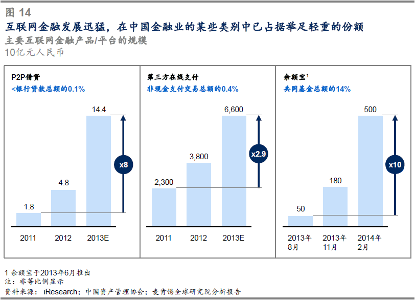 不仅是中国互联网对中国GDP直接作出的贡献比例在提升,在对GDP影响最重的几个最重要的领域:消费电子、汽车、化工、金融服务、房地产以及医疗卫生,互联网的发展对其都在产生着史无前例的影响。麦肯锡全球研究院预计,互联网能促进年GDP提高4万亿-14万亿元人民币(6400亿-2.26万亿美元)。2025年的年度GDP中近10万亿(1.6万亿美元)能否实现将取决于互联网应用的速度和深度。下面是来自阿里研究院的一些数据整理。