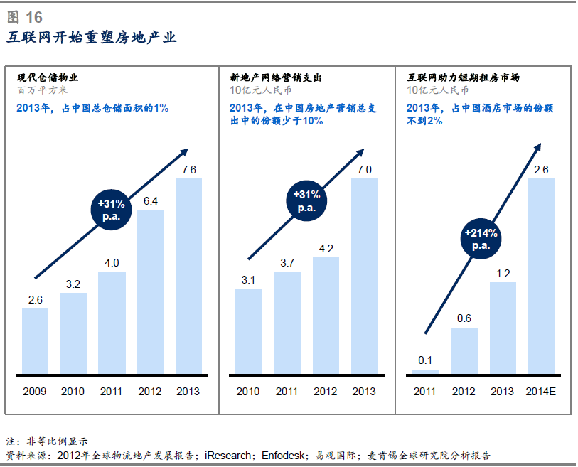 房地产。中国的购房者和租房者越来越倾向于在网上搜索理想居所。类似搜房网等电子商务平台,提供开发商、经纪人、个人房东的挂牌信息、楼盘广告和搜索功能。由于能够更快地找到有诚意的购房人,开发商和经纪人可以优化房地产搜索和交易流程,降低营销和存货成本。地方政府现在可以搭建土地招拍挂网上交易平台以增加信息透明度。此外,淘宝网也推出了抵押房产的拍卖平台。电子商务平台让房地产开发商、承包商和连锁酒店可以在各类电子商务平台上采购建筑材料、设施、设备和装潢材料。互联网更改变了商业房地产的需求,网络零售降低了实体网点的需求,却提高了拥有先进物流的现代仓储地产的需求。互联网对房地产产生的可量化影响充满不确定性。预计到2025年,该行业的GDP增长可能因为互联网降低3%或增加6%。